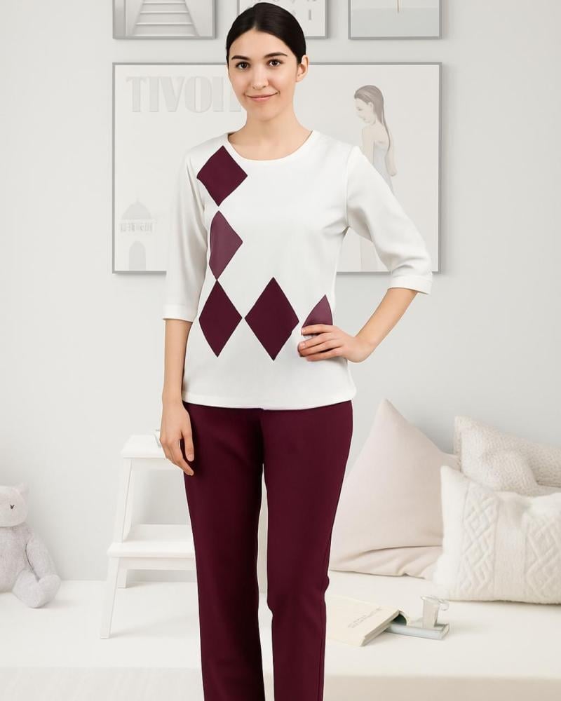 An elegant and functional housekeeping uniform set featuring burgundy diamond embroidery, crafted for maximum comfort and a polished appearance. Perfect for professional housekeepers working in homes, hotels, and resorts.