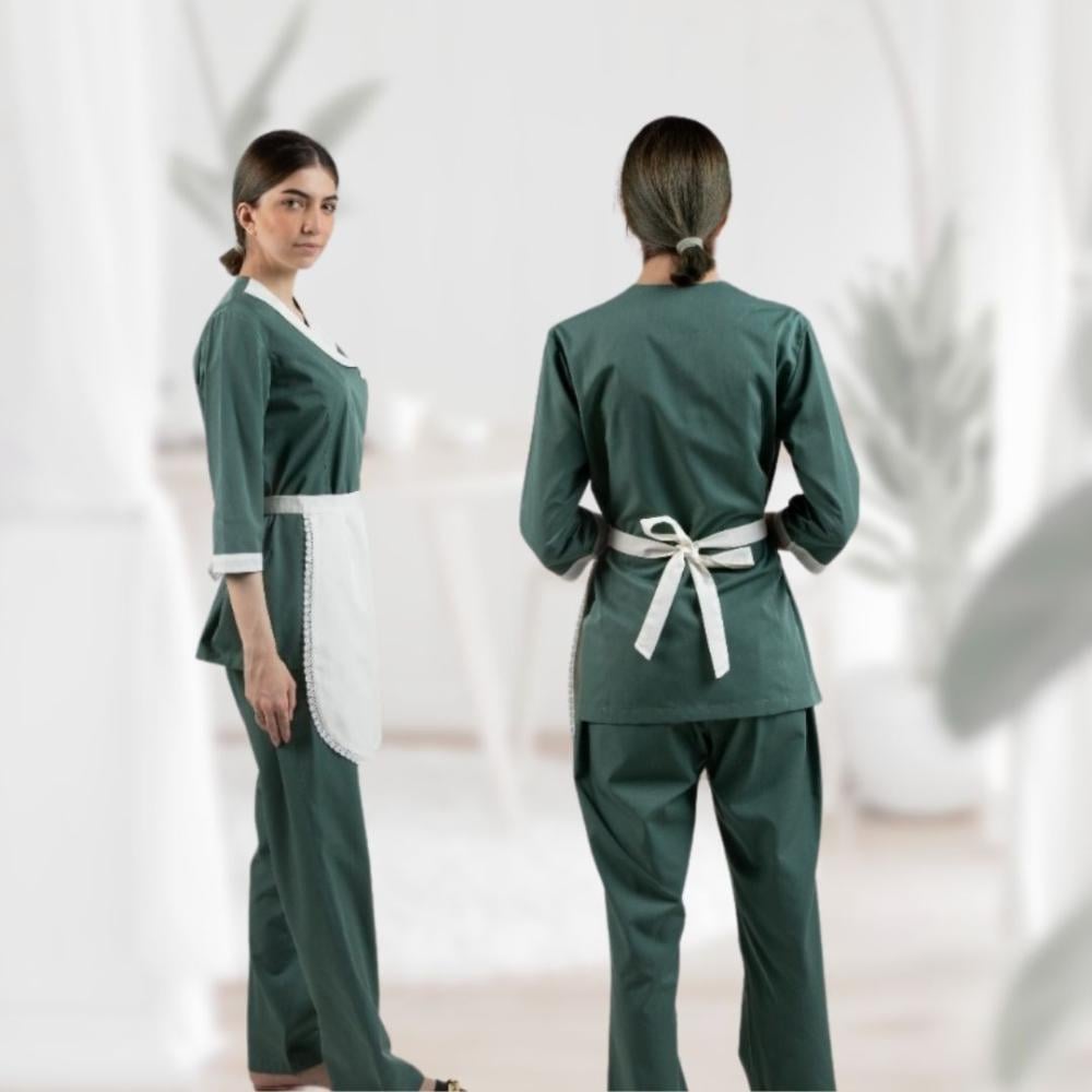 A sophisticated and functional housekeeping uniform set in green with a white collar, designed for housekeepers who need comfort, elegance, and professionalism throughout their working hours.