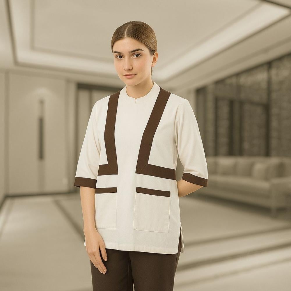 - طقم عملي أنيق للعاملات بتصميم يجمع بين المتانة والراحة والمظهر المهني، مثالي للاستخدام اليومي في البيئات المنزلية والفندقية.